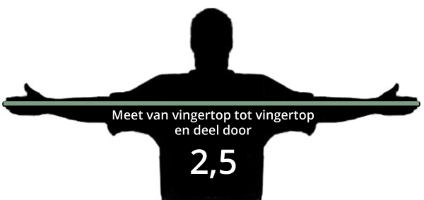 Mit dieser Methode bestimmst Du deine Zuglänge indem du deine Armlänge misst und teilst diese Zahl bei 2,5.  Am besten solltest Du dies mit einer weiteren Person machen. Stelle Dich grade hin mit lockeren Schultern. Stecke Deine Arme nicht zu viel aber deine Elenbogen solltest Du auch nicht biegen. Jetzt kann die andere Person die Länge von einem Mittelfinger zum anderen messen. So bekommst du eine relative genau Angabe deiner Zuglänge, jedoch gibt es Fälle, bei denen die Angabe nicht 100 Prozent korrekt ist.